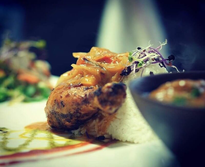Poulet braisé, aloko, salade fraicheur, pomme rissolée et sa sauce kankan.